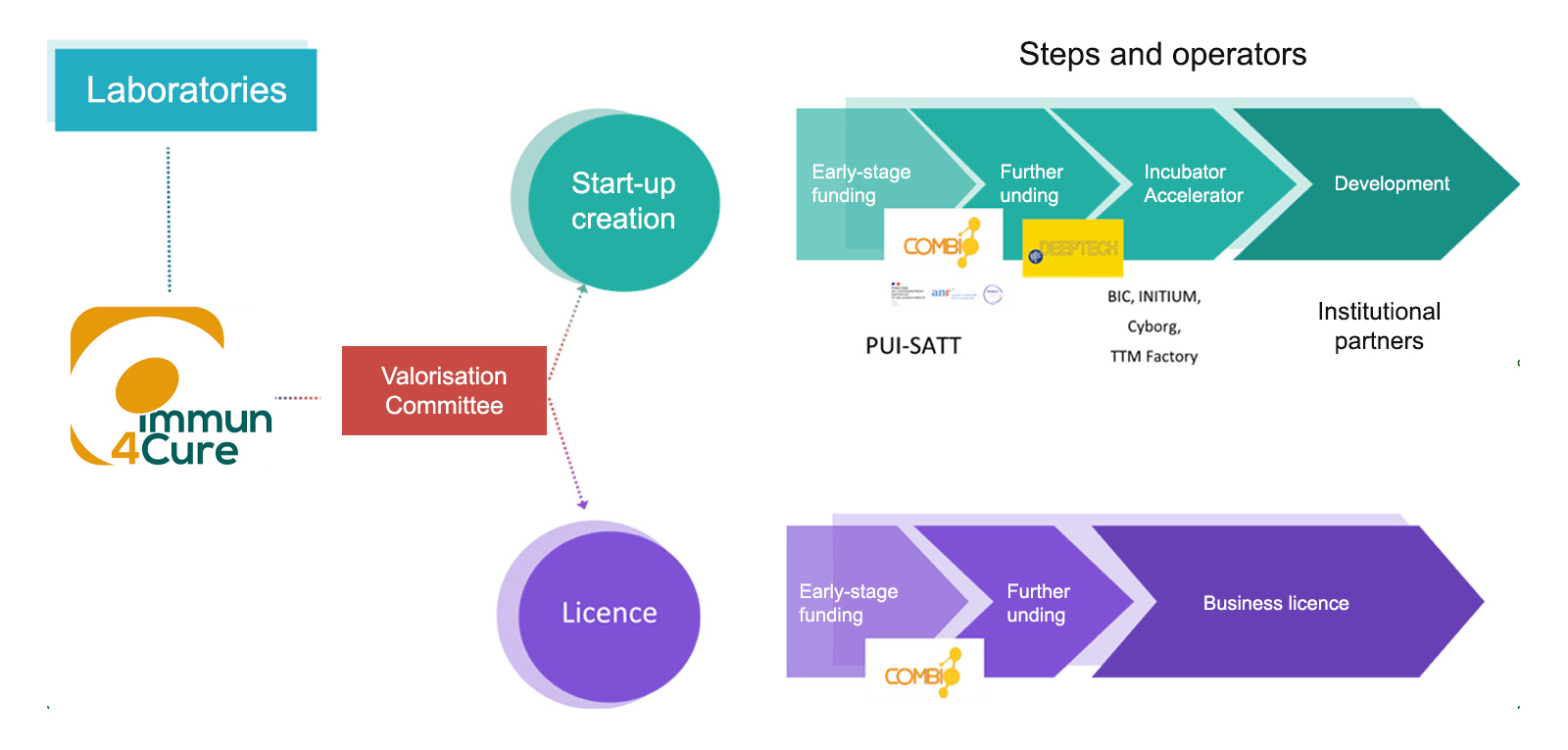 Immun4Cure has a dedicated valorisation committee composed of founding members and partners, whose mission is to evaluate and select projects from research teams within the institute perimeter that will be submitted for early-stage funding to the Montpellier University Innovation Cluster (PUI) and for further development to the SATT AxLR. This committee will also be able to issue an opinion on the most appropriate commercialisation route, i.e. the creation of start-ups or the transfer of operating licences to an existing company.